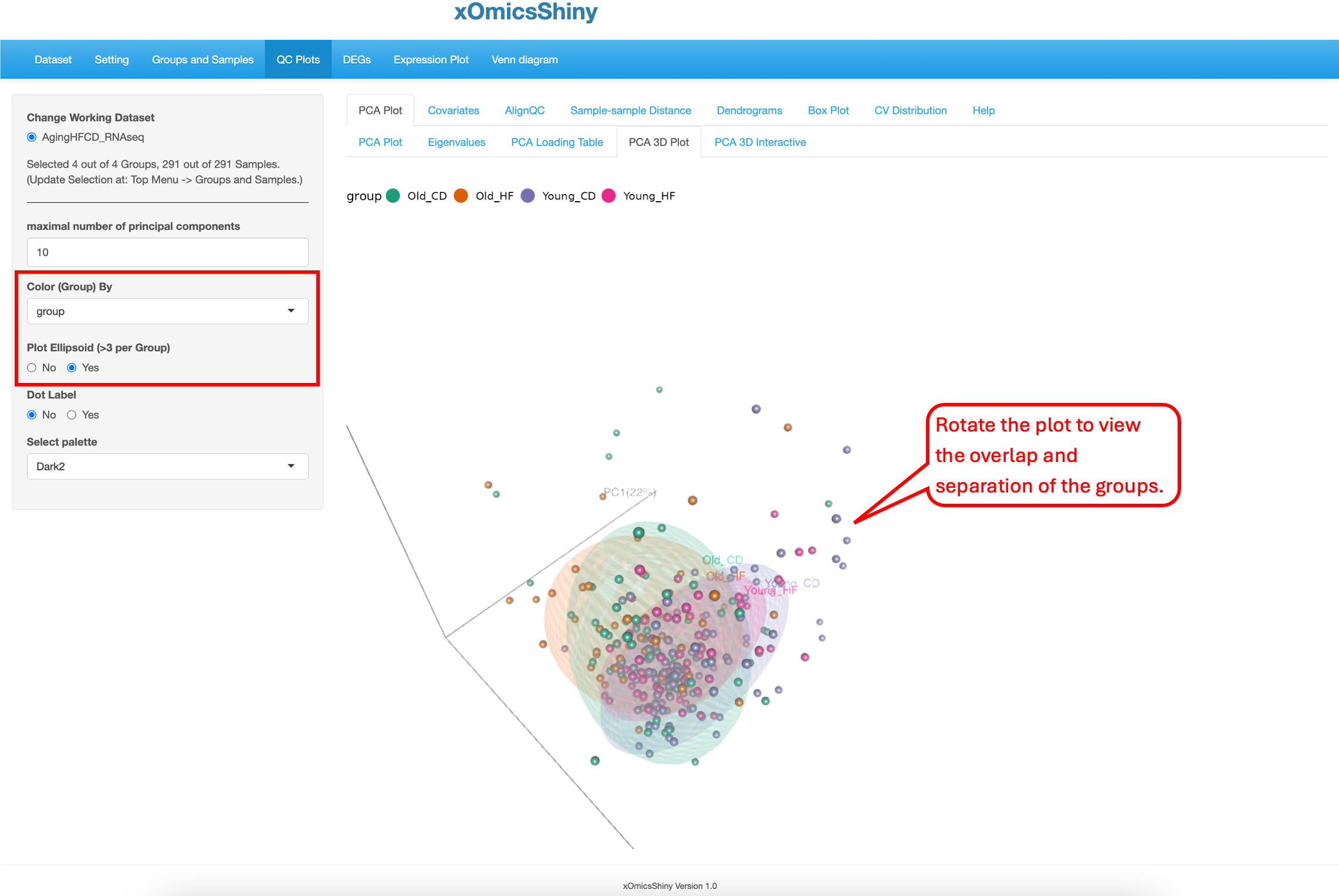 This sub-tab contains a way to perform 3D PCA representation. The functionality is limited to doing so only on PC1, PC2 and PC3. Users can zoom in and out to focus on different areas of the plot or rotate the plot in different axes to find the best separation by age as shown below. There are 5 attributes that can be changed: maximal number of principal components, color by group, ellipsoid inclusion, labels of the samples and color scheme.