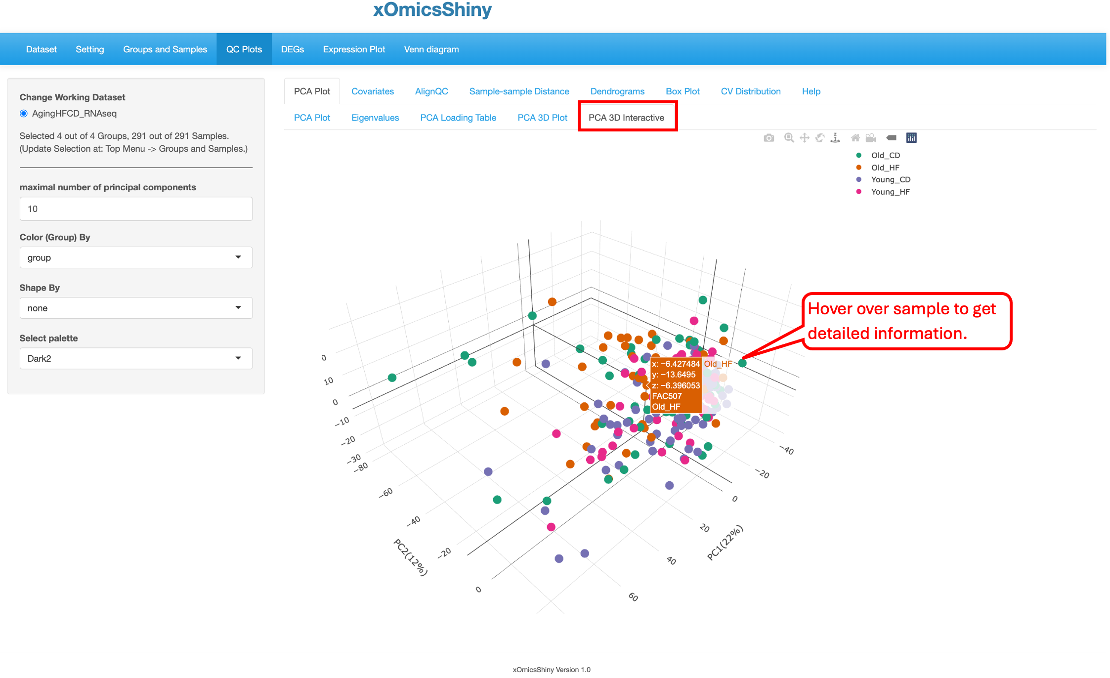 This tab is similar to the previous one (5.4 PCA 3D Plot), but here users have the additional capability to hover over the samples on the plot to identify more details, see the pointer below. This was implemented through the plotly package in R. Users can change 4 attributes here: maximal number of principal components, color by group, shape by group, and color scheme.